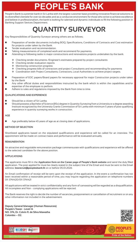 People’s Bank is seeking a skilled and passionate Quantity Surveyor to join our Banking Support Services team.