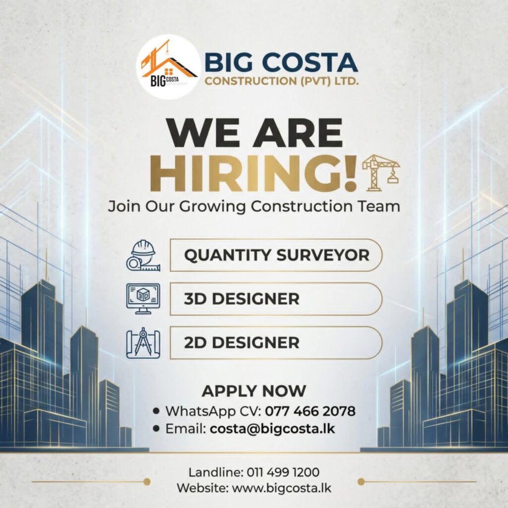 Quantity Surveyor Quantity Surveyor/ 2D/ 3D Designer 59 minutes ago Deadline :- 28th December 2025 Company:- Big Costa Construction Pvt ltd Apply Now :- costa@bigcosta.lk Post navigation Previous: Site EngineerNext: Help desk Engineer/ Technician- IT Support & Infrastructure Related Vacancies Quantity Surveyor Quantity Surveyor 31 minutes ago Banking Government Job Quantity Surveyor Quantity Surveyor 10 hours ago Engineering Manager Quantity Surveyor Project Manager/ Site Engineer/ Quantity Surveyor 12 hours ago
