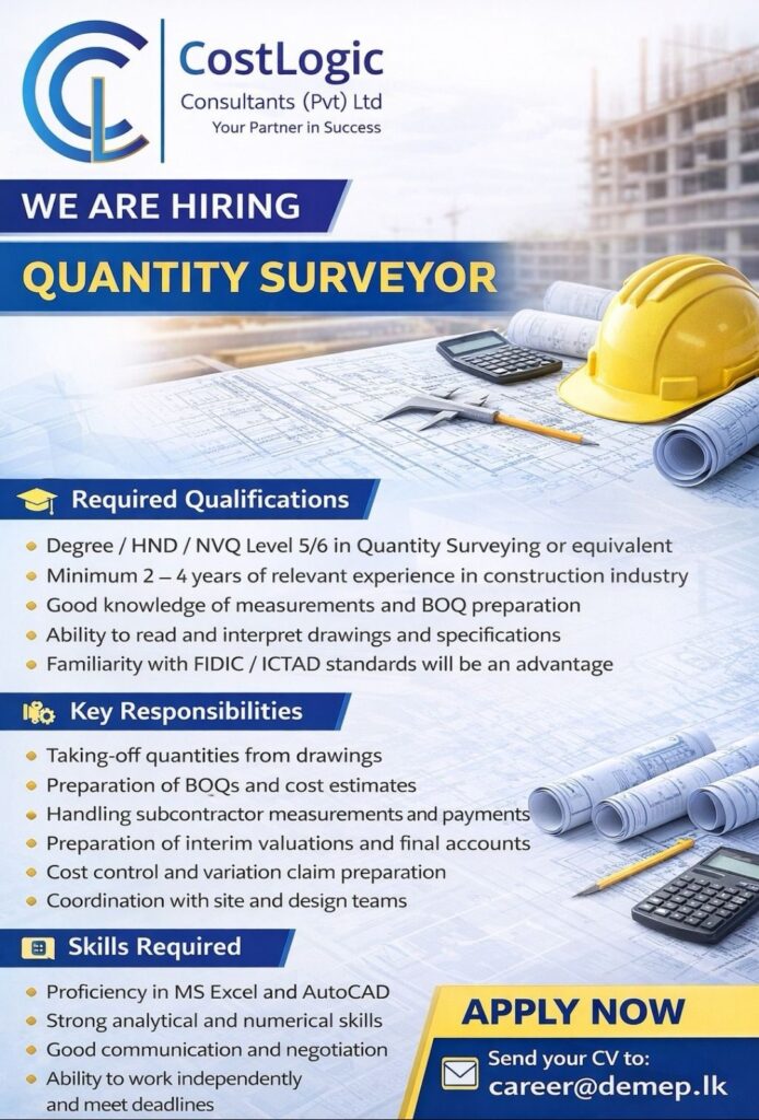 If you have strong experience in BOQ preparation, cost estimation, interim valuations, and contract administration we invite you to apply and grow with us.
