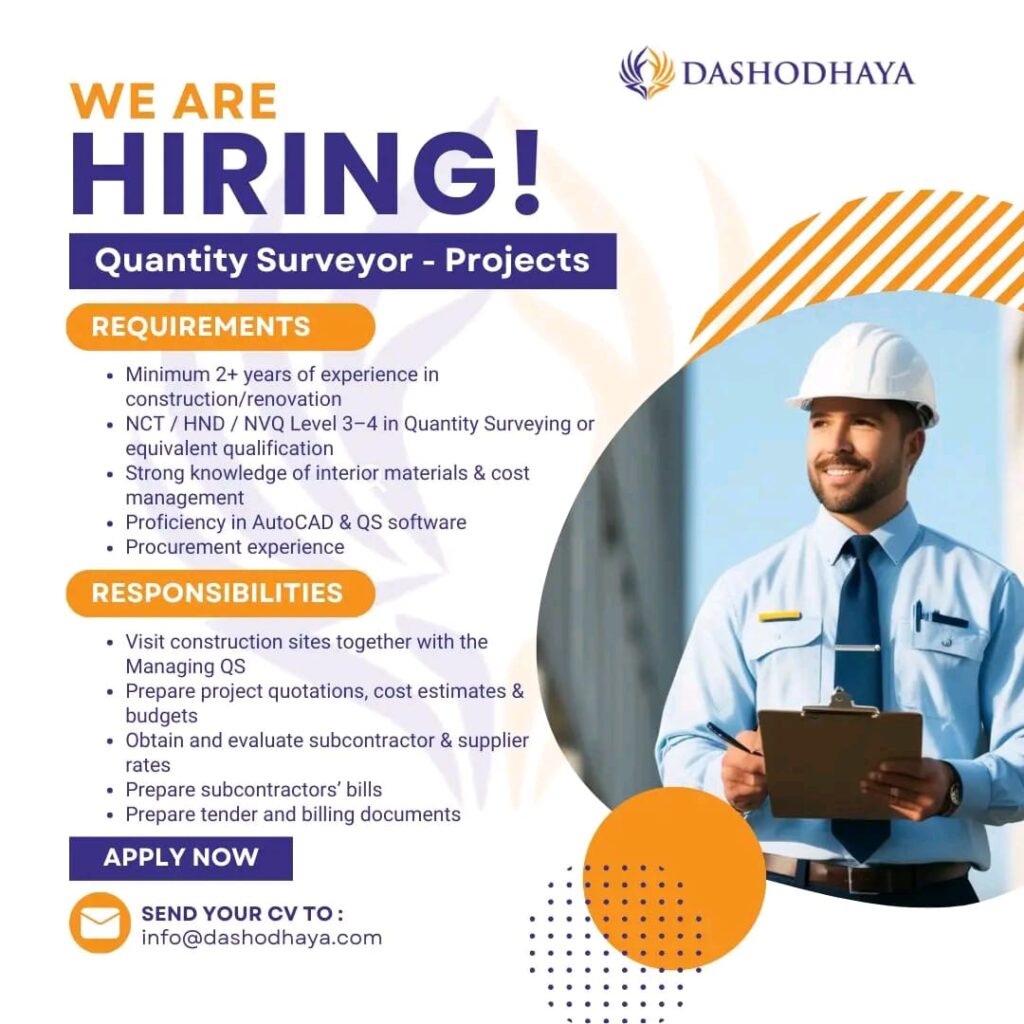 ✔️ NCT / HND / NVQ Level 3–4 in Quantity Surveying or equivalent qualification recognized in Sri Lanka
