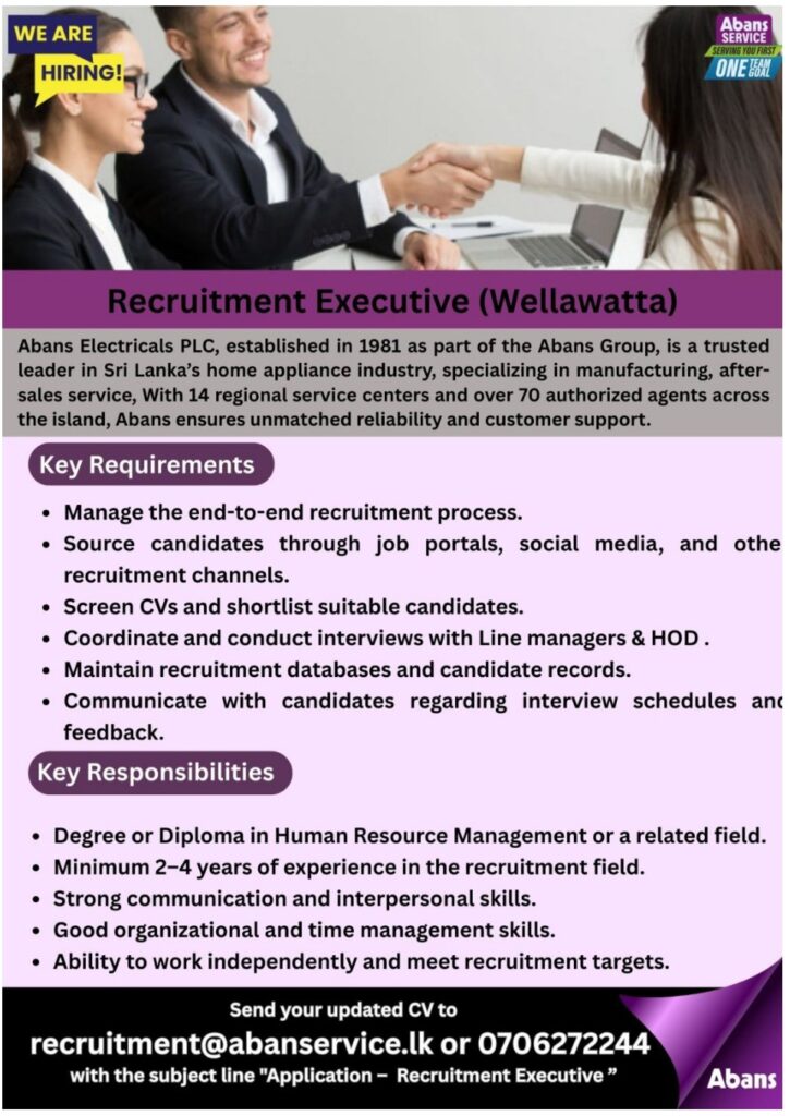 Abans Electricals PLC is looking for an experienced Recruitment Executive to join the team in Wellawatte.