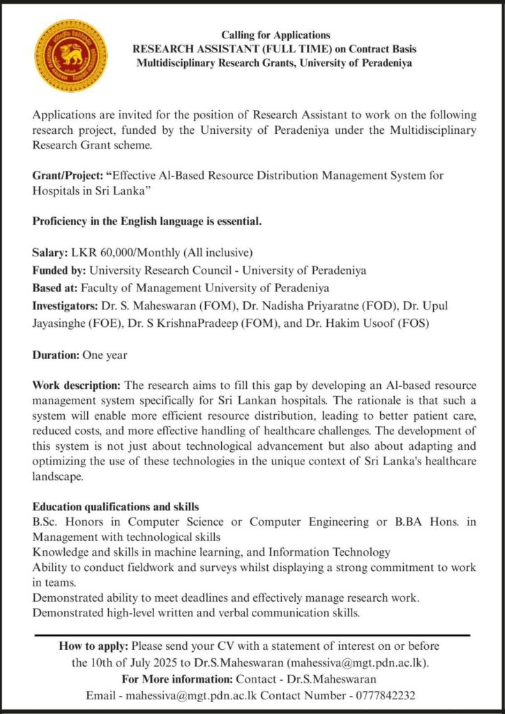 Send your CV:- mahessiva@mgt.pdn.ac.lk