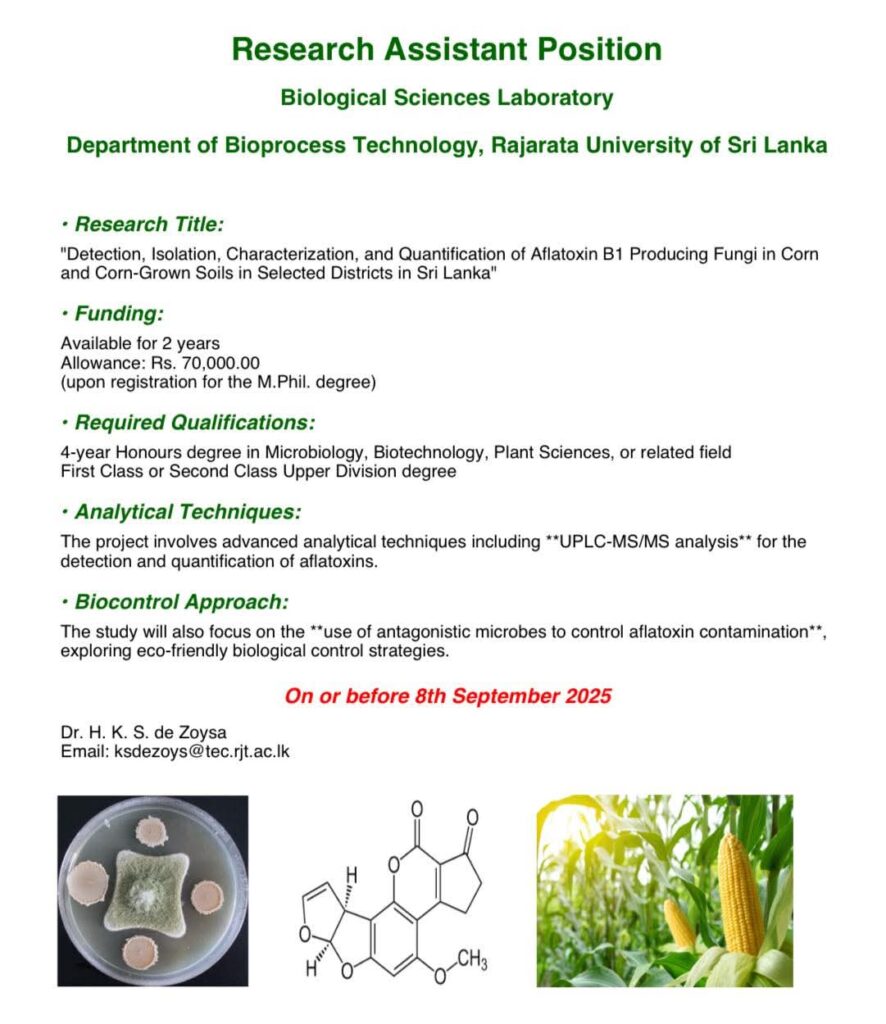 The Biological Sciences Laboratory, Department of Bioprocess Technology, Rajarata University of Sri Lanka, is seeking a highly motivated Research Assistant for a project on: