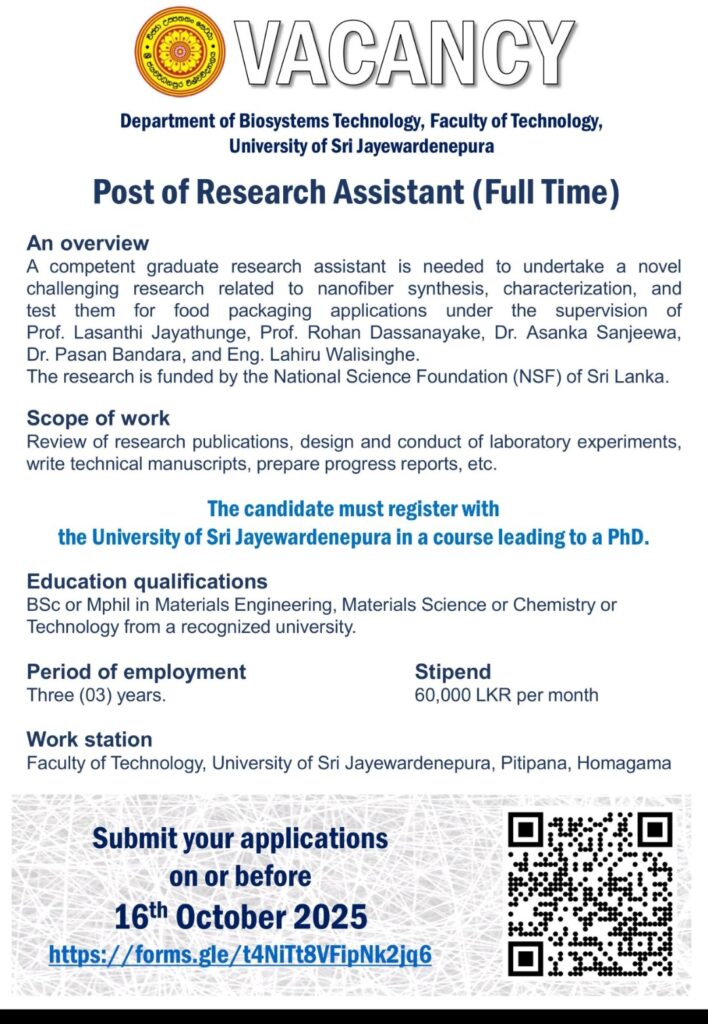 The Department of Biosystems Technology, Faculty of Technology, University of Sri Jayewardenepura (USJ), is seeking a motivated Research Assistant to contribute to an exciting PhD project funded by the National Science Foundation (NSF) of Sri Lanka.