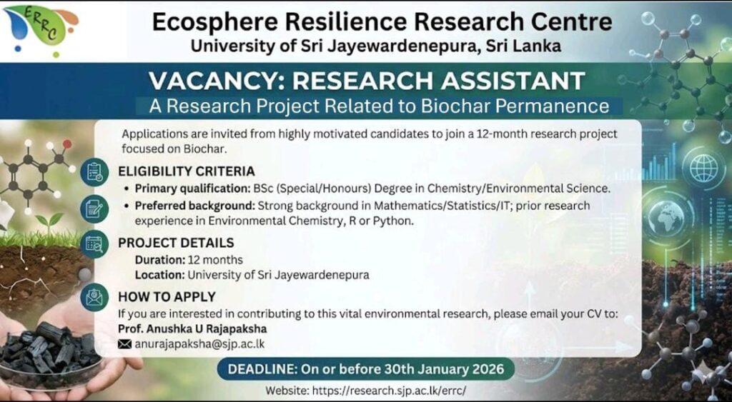 Ecosphere Resilience Research Centre (ERRC) University of Sri Jayewardenepura, Sri Lanka We invite applications from highly motivated graduates to join a 12-month funded research project focused on biochar permanence and environmental resilience.