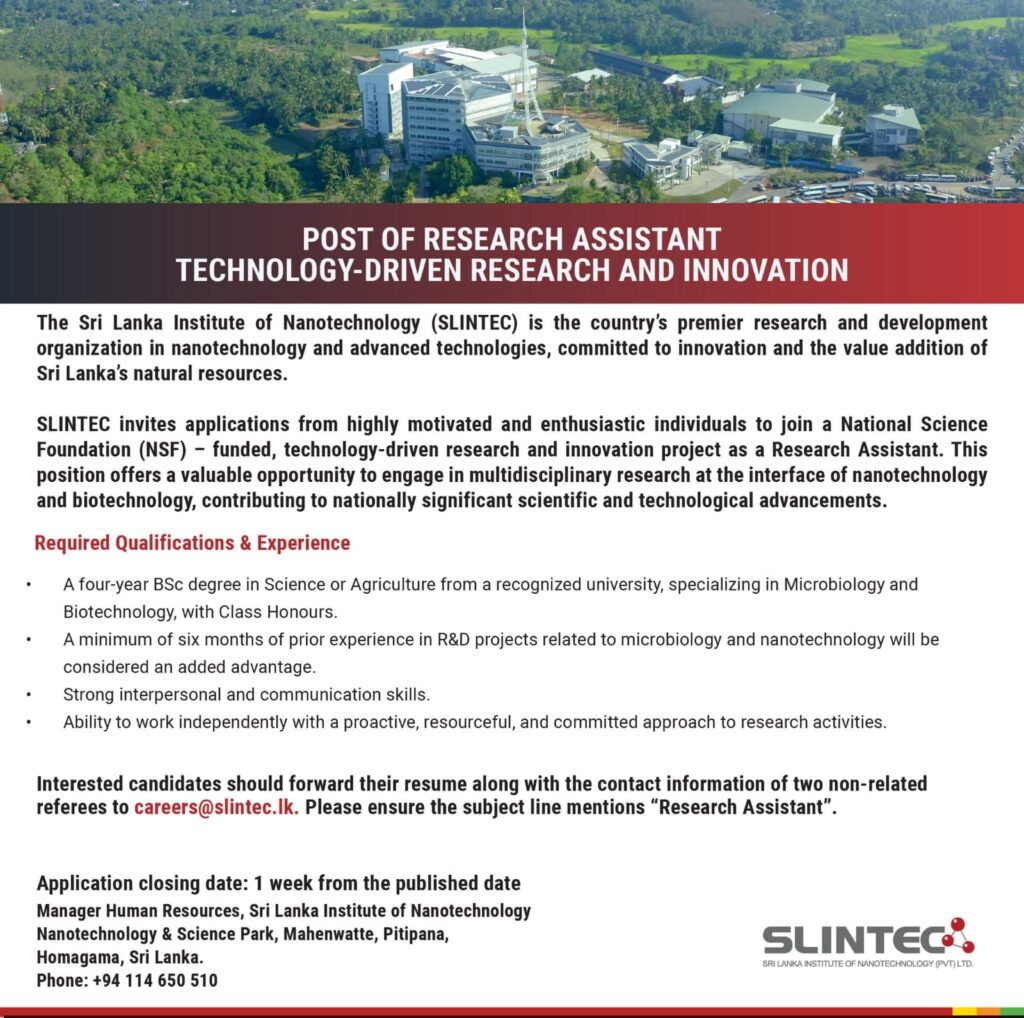 Are you a passionate researcher ready to dive into the world of Nanotechnology and Biotechnology? The Sri Lanka Institute of Nanotechnology (SLINTEC) is looking for a driven Research Assistant to join a high-impact, NSF-funded project focused on technology-driven innovation.