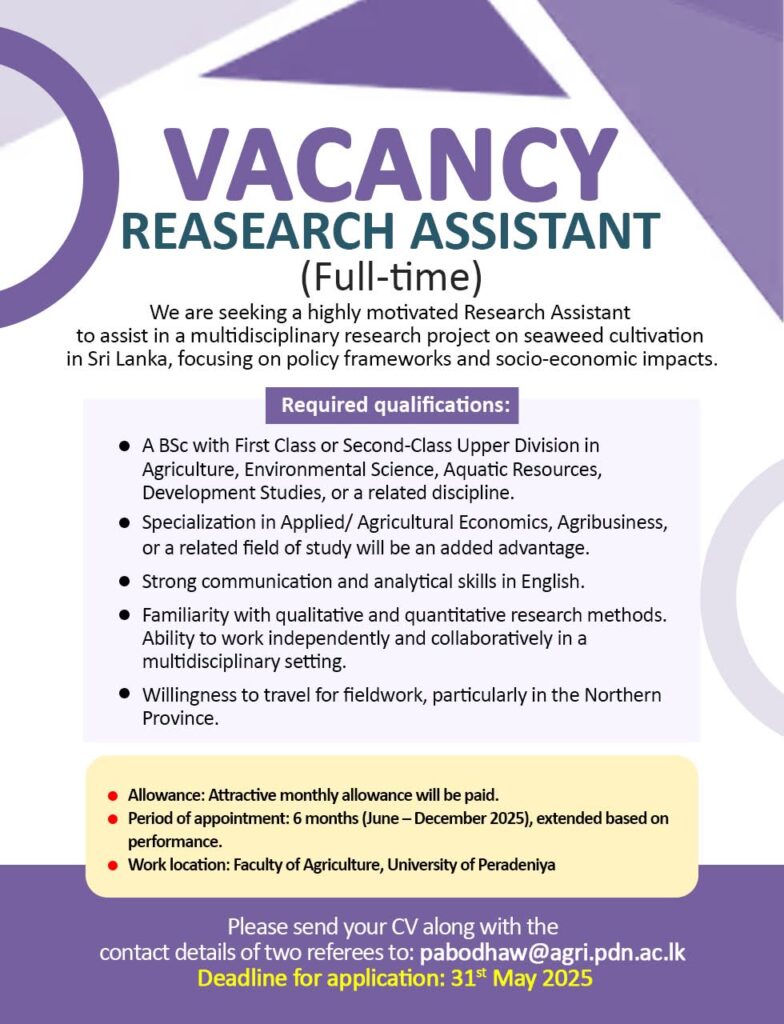 Interested candidates are requested to submit their CV to pabodhaw@agri.pdn.ac.lk by 31st May 2025.