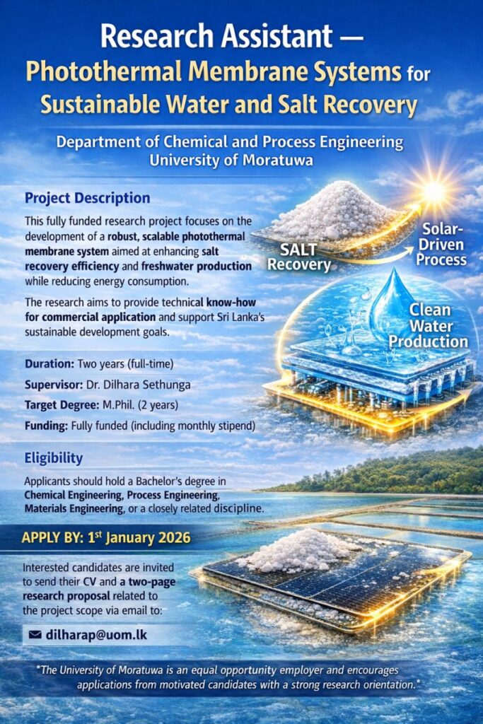 We are pleased to invite applications for a Research Assistant (M.Phil.) position under a fully funded research project at the University of Moratuwa – Department of Chemical & Process Engineering.