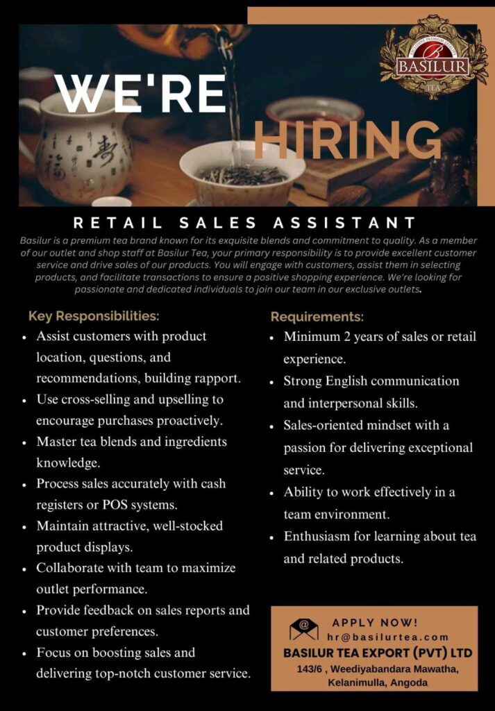 As a member of our outlet and shop staff at Basilur Tea, your primary responsibility is to provide excellent customer service and drive sales of our products.