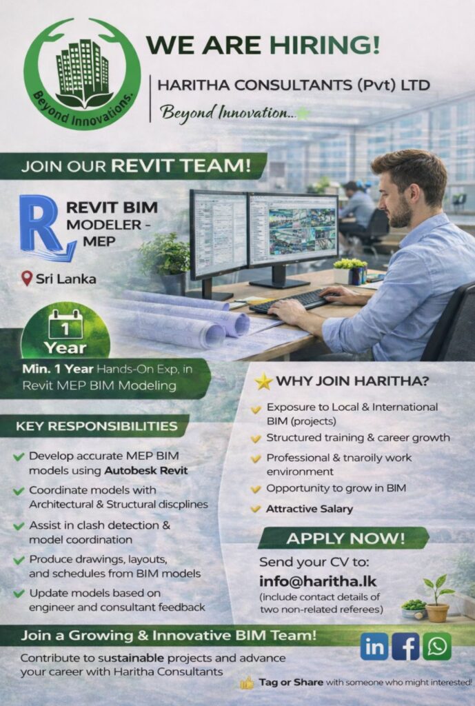 Haritha Consultants (Pvt) Ltd is growing, and we’re looking for a BIM Modeler – MEP with minimum 1 year of hands-on experience in Revit BIM Modeling to join our team.
