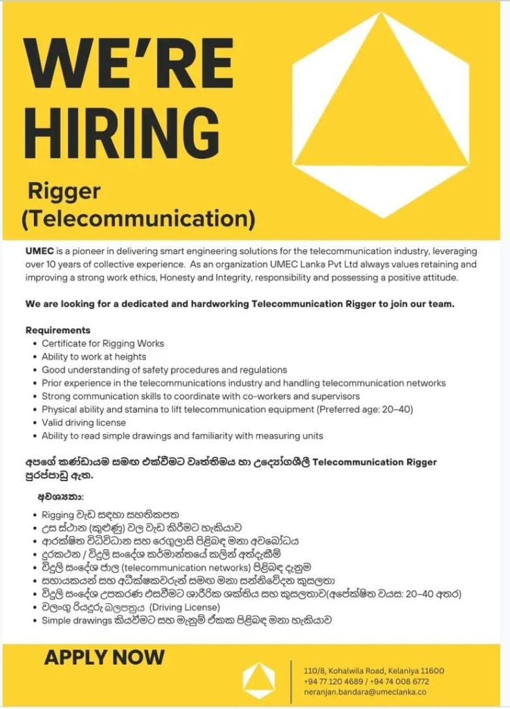 UMEC Lanka is recruiting Telecommunication Riggers with experience and a positive attitude. Think you’ve got what it takes?