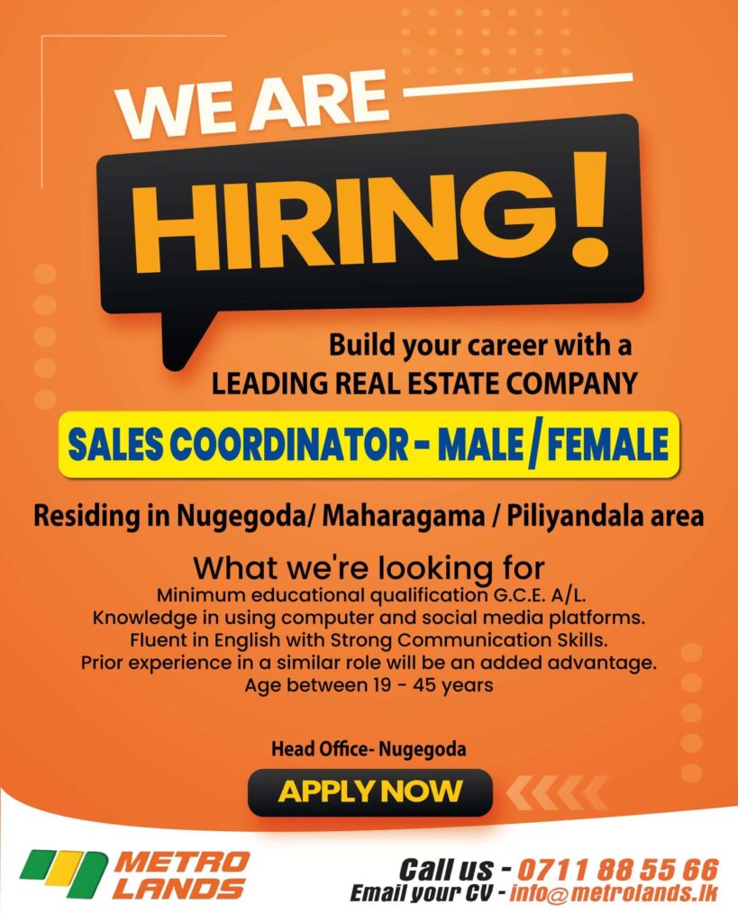 WE ARE HIRING SALES COORDINATOR – MALE / FEMALE