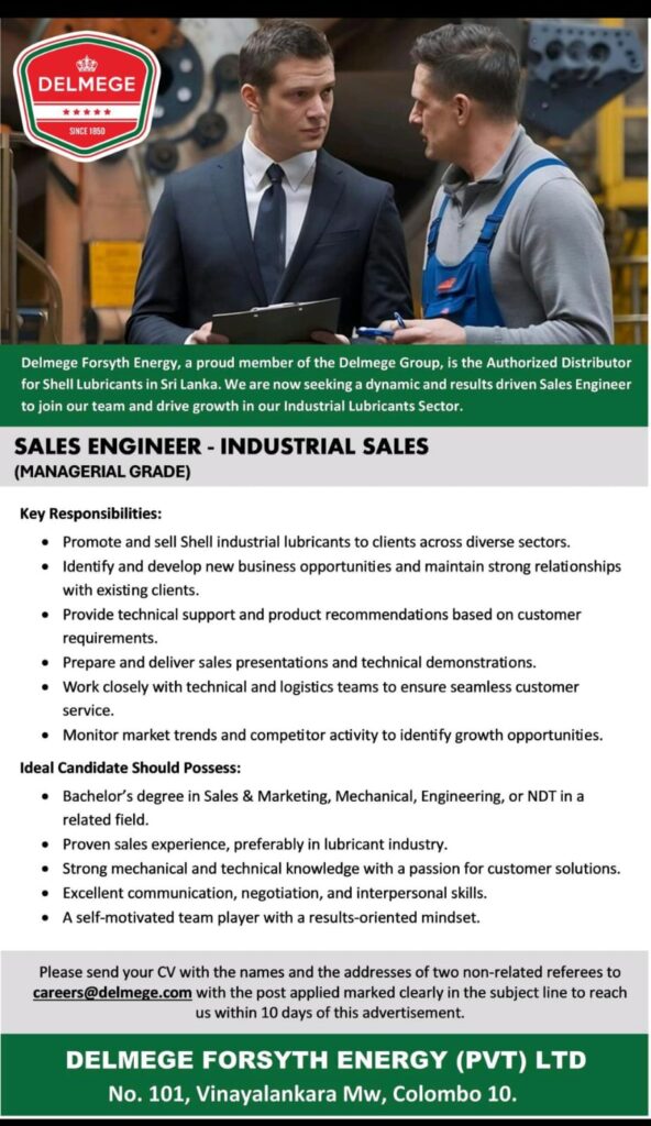 Delmege Energy (Pvt) Ltd., the Authorized Distributor for Shell Lubricants in Sri Lanka, is looking for a dynamic Sales Engineer to join our team.