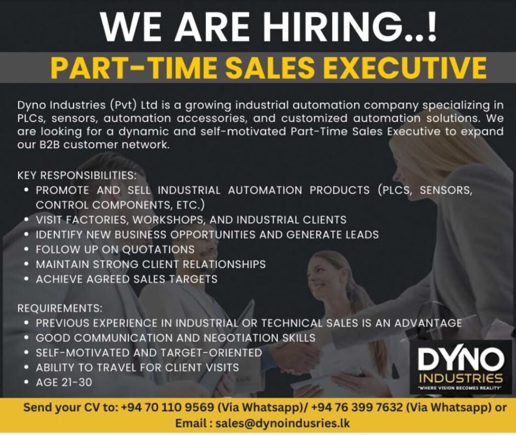 Dyno Industries (Pvt) Ltd is looking for a Part-Time Sales Executive to promote our industrial automation products (PLCs, sensors, and control components).