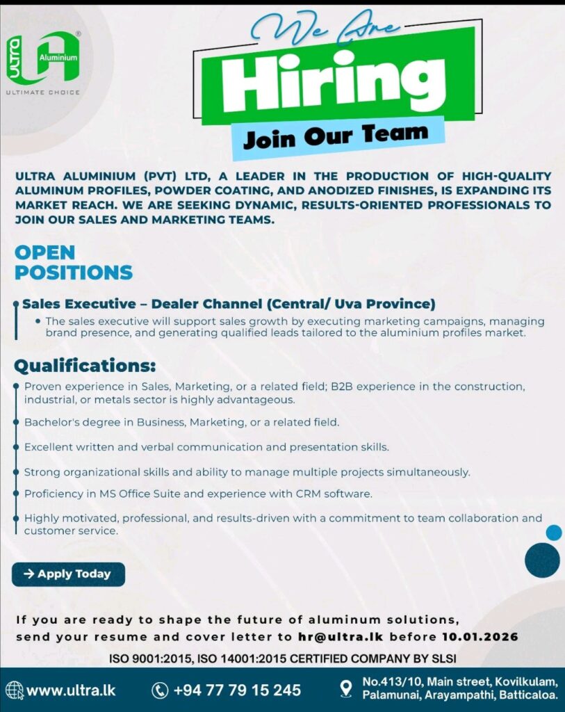 Ultra Aluminium (PVT) LTD, a leader in high-quality aluminium profiles, powder coating, and anodized finishes, is looking for a dynamic, results-oriented professional to join our Sales and Marketing team!.