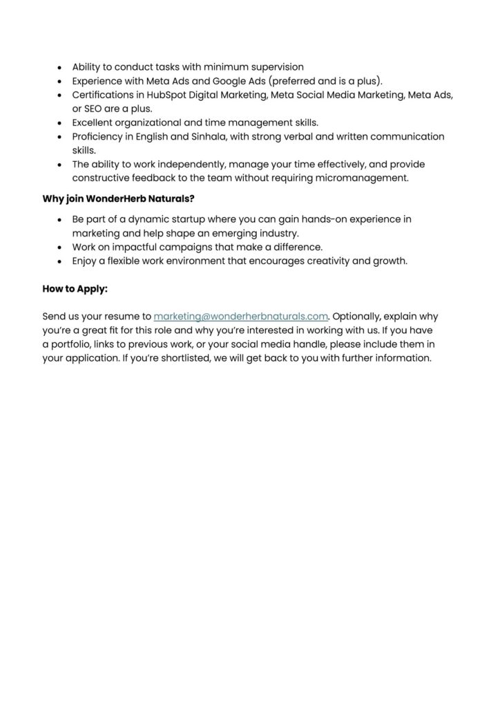 Internship Sales and Marketing Sales Marketing and Operations Internship 1 month ago Deadline:- 3rd November 2025 Company:- Wonderherb Naturals Pvt ltd Location:- Battramullla Post navigation Previous: WordPress Developer InternshipNext: MEP Engineer Related Vacancies Internship IT Jobs Remote Work opportunity AI/ML Internship 6 hours ago Art Digital Marketing Graphic Designer Internship IT Jobs Digital Media Executive/ Creative Designer/Accounts Manager/ Internship 14 hours ago Digital Marketing Internship Remote Work opportunity Digital Marketing Internship 2 days ago
