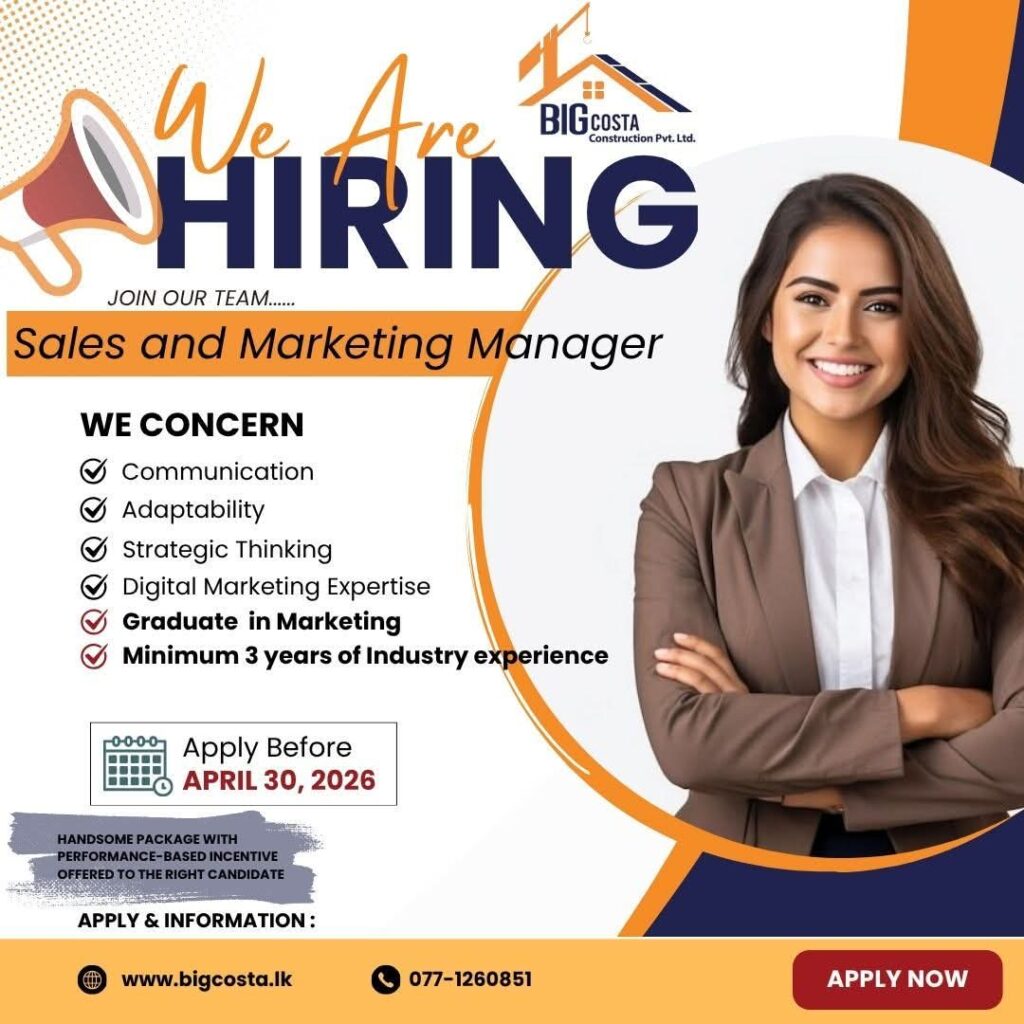 Manager Sales and Marketing Sales & Marketing Manager 30 minutes ago Deadline:- 30th April 2026 Company:- Big Costa Construction Pvt ltd Apply now. – 0771260851 Post navigation Previous: Vendor Acquisition – Executive Related Vacancies Business Management Sales and Marketing Vendor Acquisition – Executive 31 minutes ago Admin Business Administration Manager Office Manager 33 minutes ago Business Administration Finance and Accounts Sales and Marketing Regional Sales Officer/ Branch Head 1 day ago