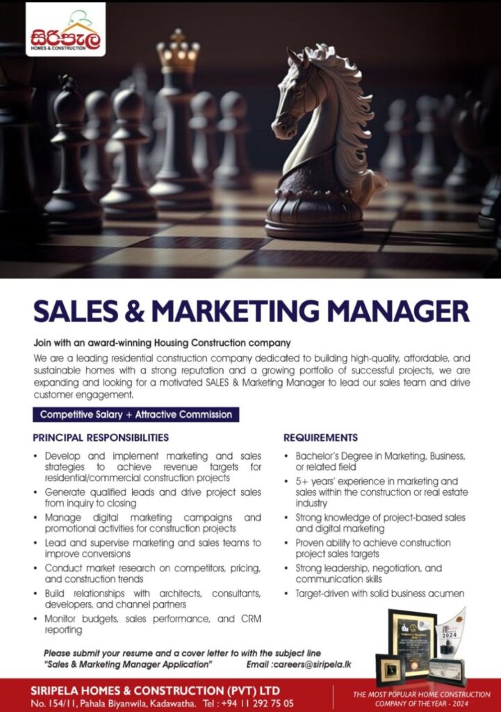 Siripela Homes & Constructions is looking for a talented SALES & MARKETING MANAGER