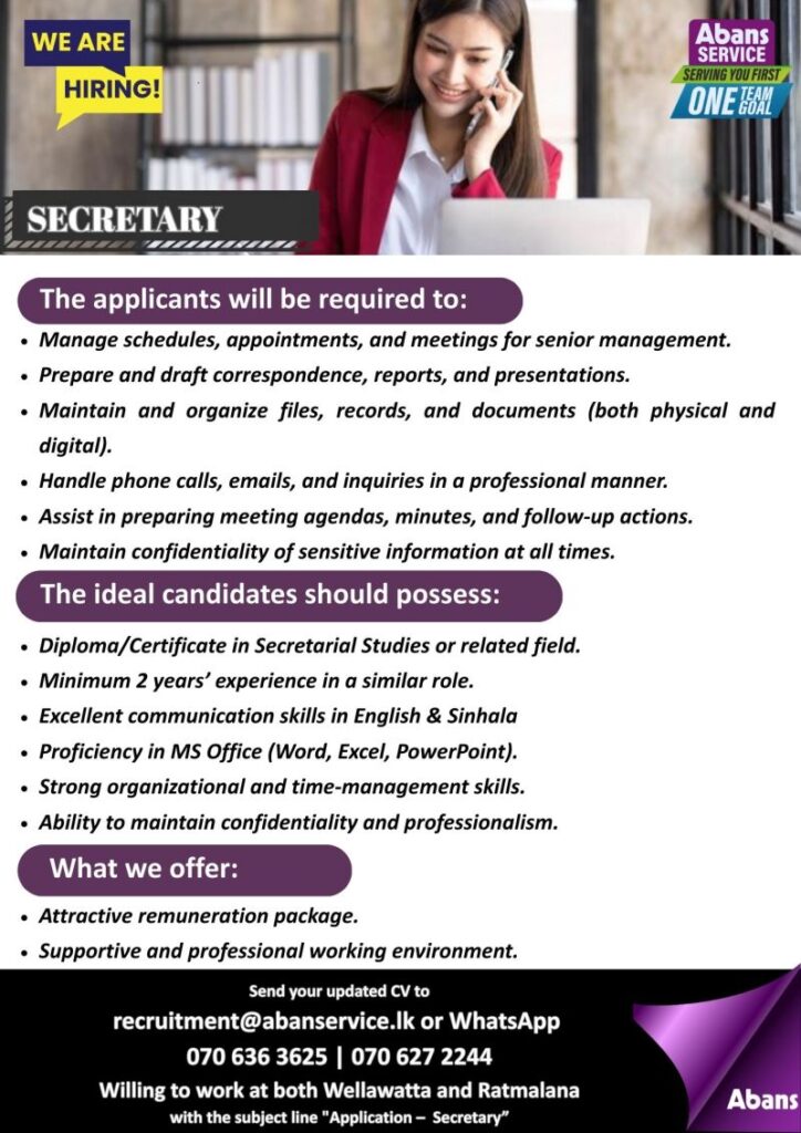 Join our dynamic team at Abans Electricals PLC! We are looking for a dedicated and highly organized Secretary to support our senior management team.