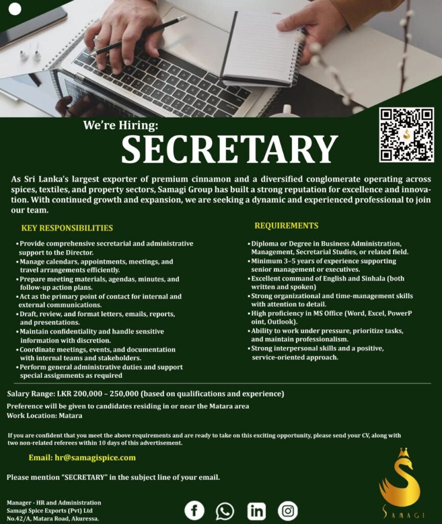 Samagi Spice Exports (Pvt) Ltd is looking for a dynamic and experienced Secretary to provide administrative and executive support to our leadership team.