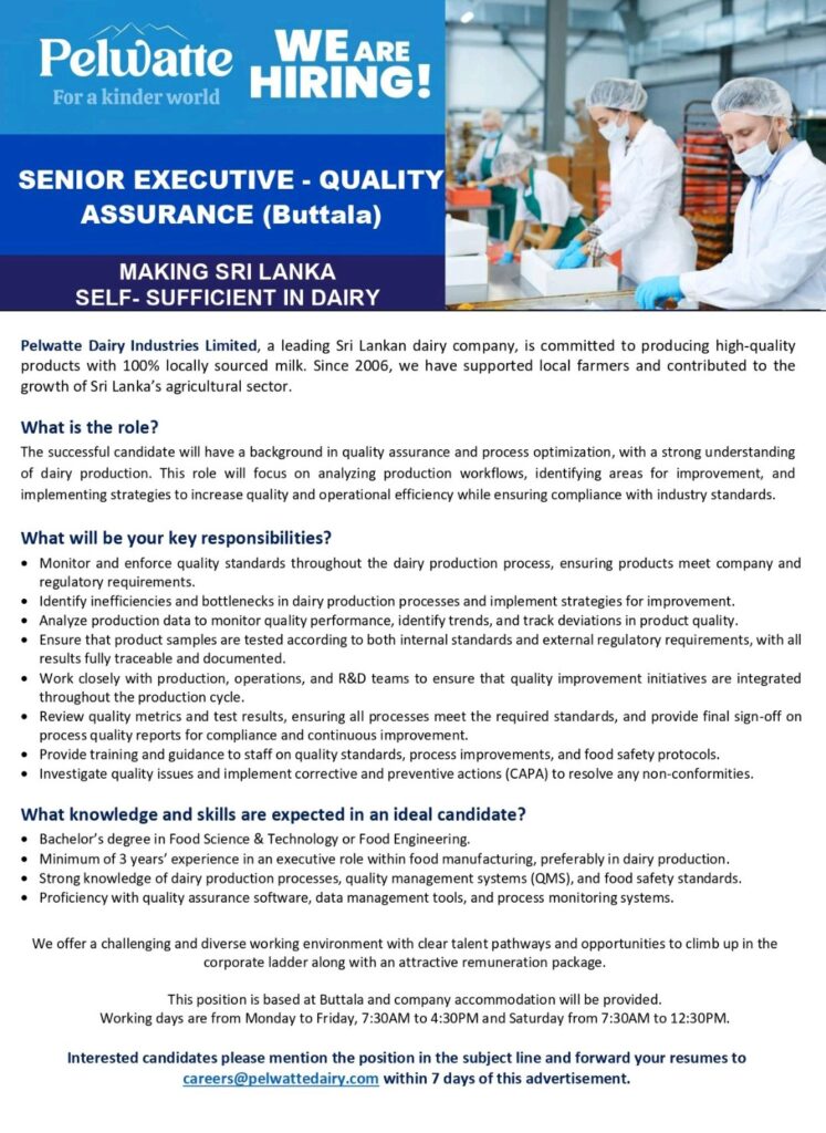 If you have a strong eye for detail, a passion for maintaining the highest quality standards, and the drive to ensure safe, premium-quality dairy products, this is your chance to build a rewarding career with one of Sri Lanka’s most respected dairy brands.
