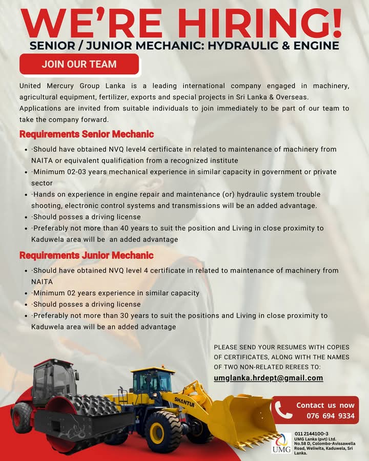 ✨Position:- Senior/ Junior Mechanic – Hydraulic and Engine