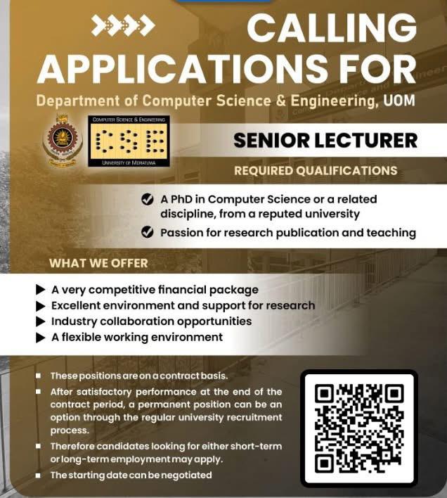 The Department of Computer Science & Engineering calls applications for the post of Senior Lecturer (Contract).