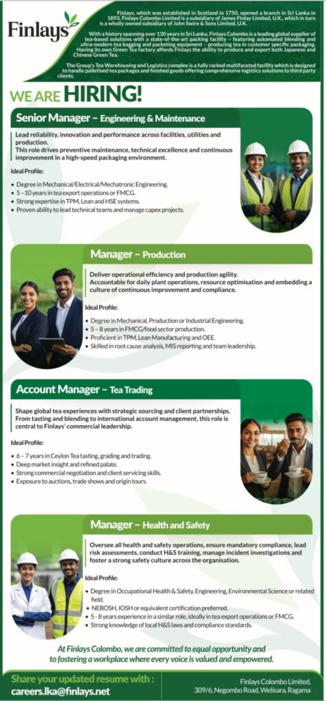 Growth is underway at Finlays Colombo Limited — and we’re hiring future-focused leaders.