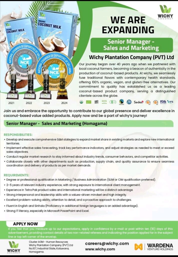Wichy Plantation Company (Pvt) Ltd is looking for a dynamic Senior Manager – Sales & Marketing to join our team.