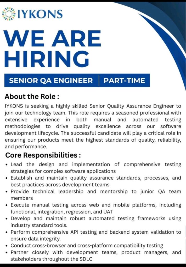 IYKONS is looking for a Senior QA Engineer (Part-Time) with 5+ years of experience to bring expertise and precision to our growing team.