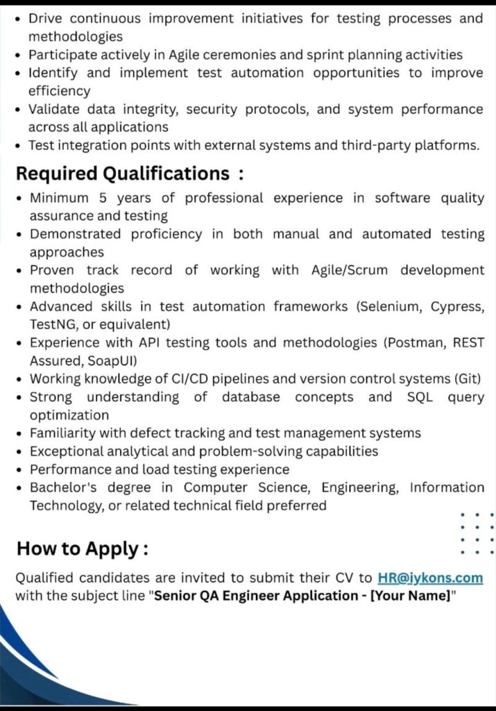 Qualified candidates are invited to submit their CV to HR@iykons.com with the subject line “Senior QA Engineer Application – [Your Name]”