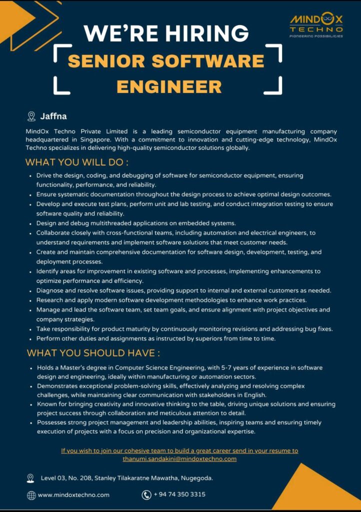Mindox Techno (Pvt) Ltd is on the lookout for a highly skilled and passionate Senior Software Engineer to power our innovative projects and be part of our growing tech family in Jaffna.