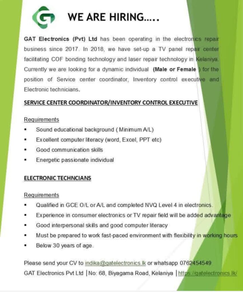 Please send your CV to indika@gatelectronics.lk or whatsapp 0762454549