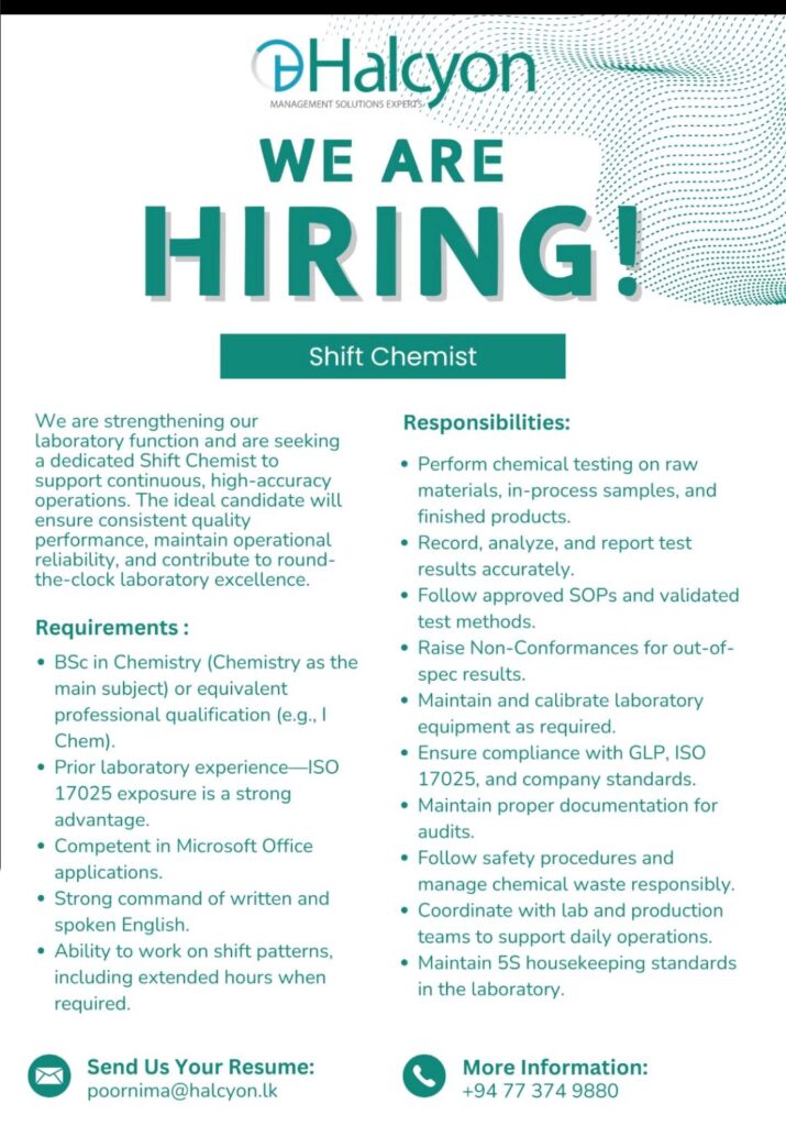 Halcyon Private Limited is looking for enthusiastic and dedicated Shift Chemists to join our 24/7 industrial laboratory team.