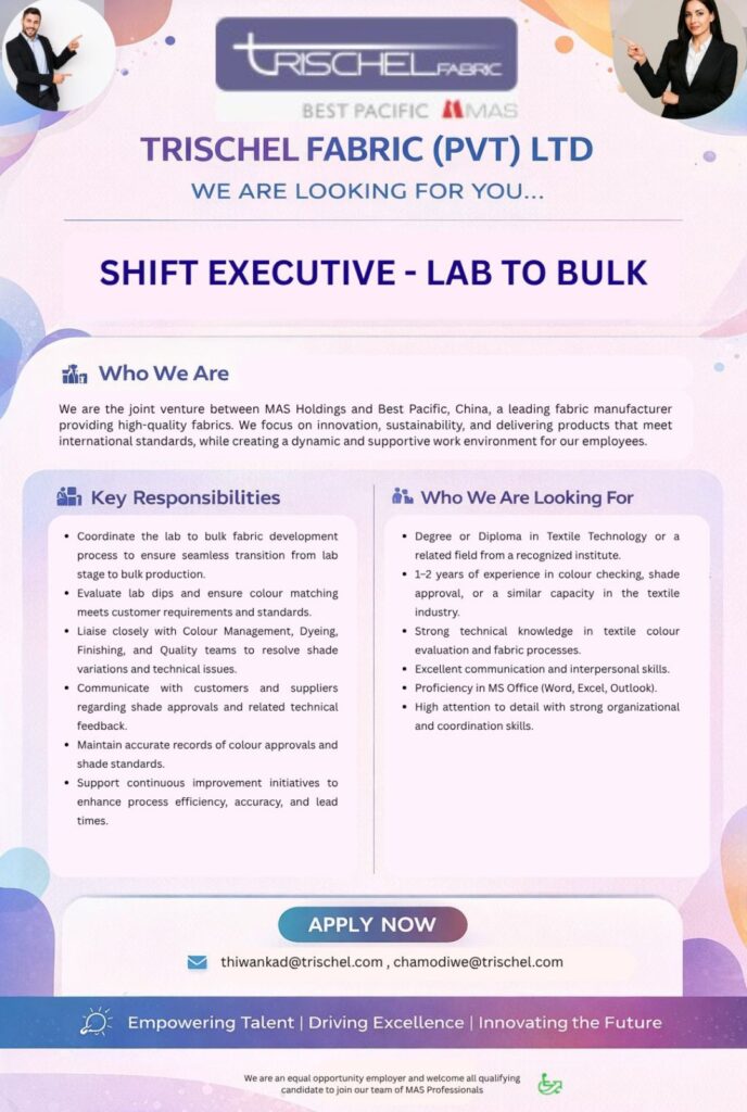 Are you passionate about textile innovation and process excellence? Join Trischel Fabric Pvt Ltd as a Lab to Bulk Shift Executive and play a key role in ensuring seamless transition from lab development to bulk production.
