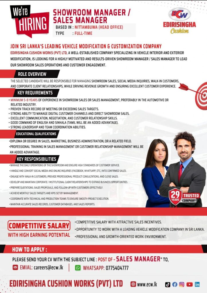 Edirisingha Cushion Works (Pvt) Ltd, Sri Lanka’s leading vehicle modification & customization company, is seeking a dynamic Showroom Manager /Sales Manager to drive our Nittambuwa showroom to the next level!