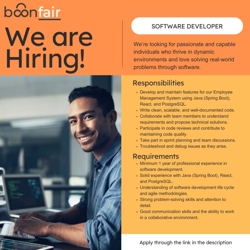 BoonFair is a fast-growing, service-based startup dedicated to delivering custom-made software tailored to our clients’ unique needs. We specialise in building scalable, efficient, and user-friendly solutions that empower businesses across industries. As we expand, we’re looking for passionate and capable individuals who thrive in dynamic environments and love solving real-world problems through software.