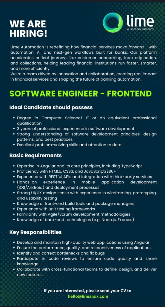 We are looking for skilled Frontend Engineers with strong Angular expertise to join Lime Automation’s product engineering team.