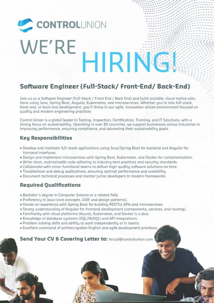 Control Union Inspections (Pvt) Ltd. – Sri Lanka is looking for a ‘𝐒𝐨𝐟𝐭𝐰𝐚𝐫𝐞 𝐄𝐧𝐠𝐢𝐧𝐞𝐞𝐫 (𝐅𝐮𝐥𝐥-𝐒𝐭𝐚𝐜𝐤/ 𝐅𝐫𝐨𝐧𝐭-𝐄𝐧𝐝/ 𝐁𝐚𝐜𝐤-𝐄𝐧𝐝)’.