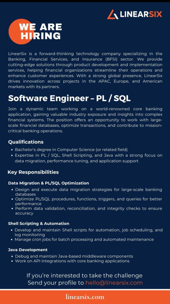 We’re seeking for a passionate Software Engineer (PL/SQL) to help us innovate and create amazing solutions.