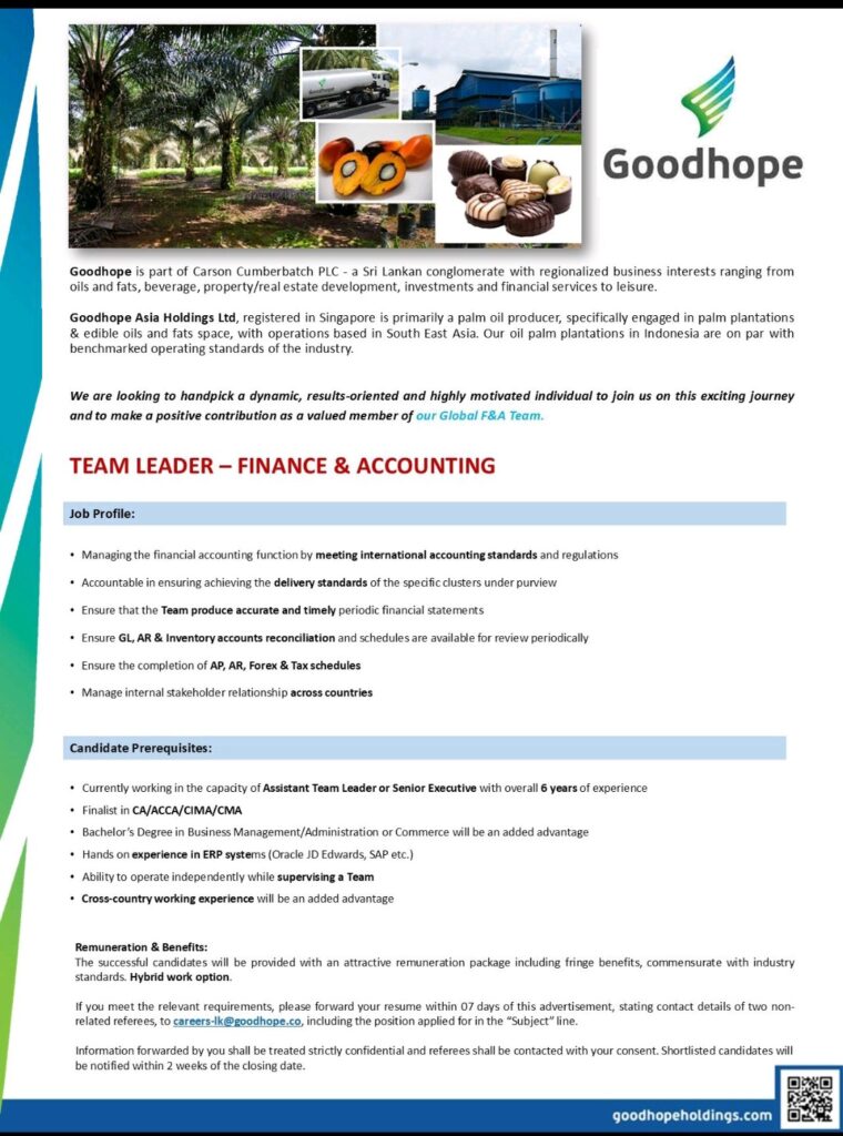We’re looking for a motivated and results-driven professional to take on the role of Team Leader -Finance & Accounting at our Corporate Office in Sri Lanka.