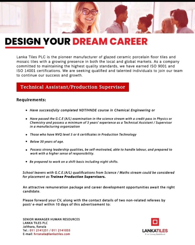 LANKATILES is looking for a skilled and self-motivated professional to join us as a Technical Assistant / Production Supervisor. This role involves supervising production operations, leading teams, and ensuring efficiency and quality in a dynamic manufacturing environment.