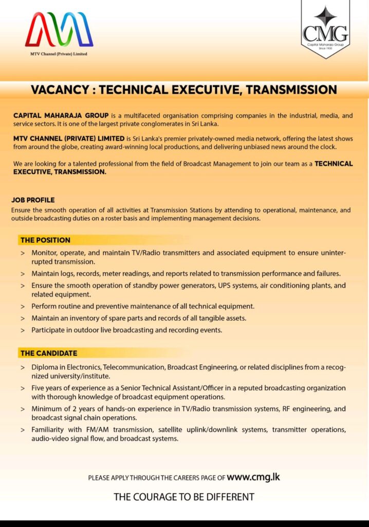 Be at the forefront of broadcast technology! MTV Channel, a leading media network under the Capital Maharaja Group, is hiring a Technical Executive, Transmission.