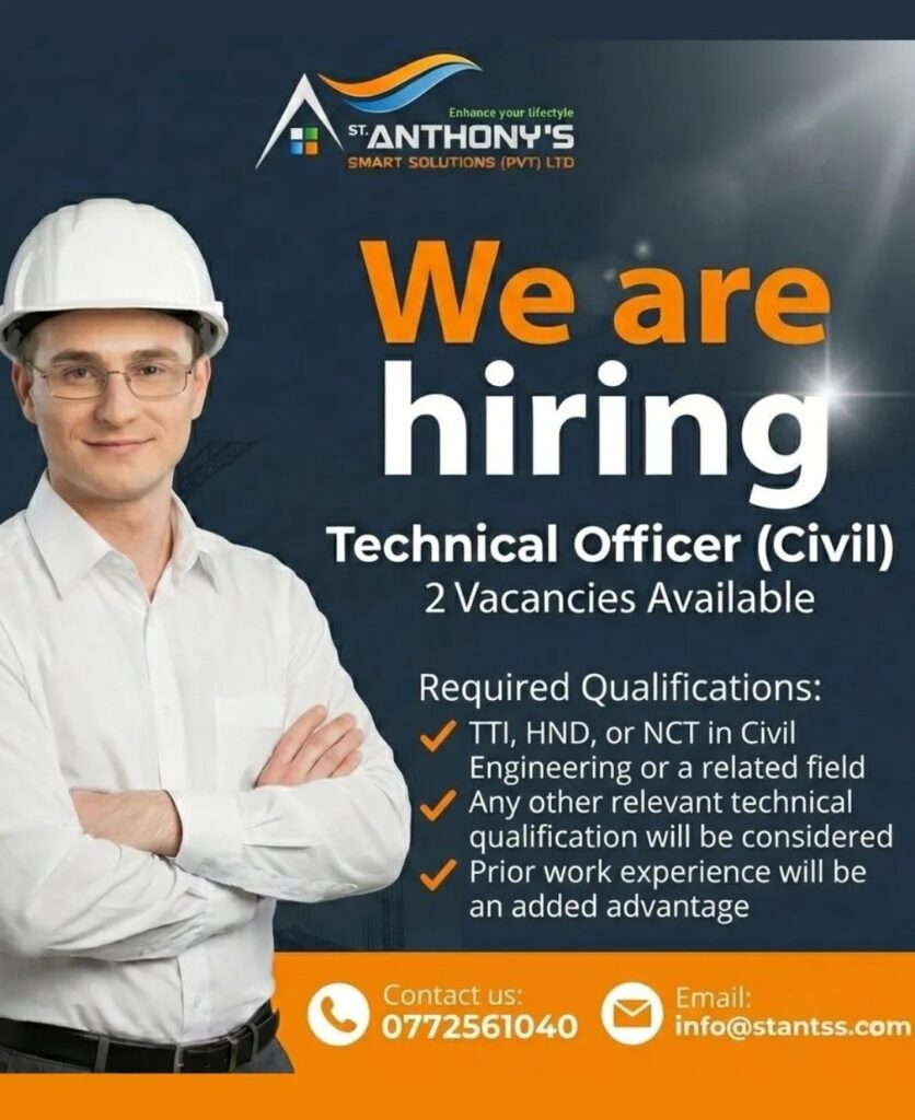 St. Anthony’s Smart Solutions (Pvt) Ltd, Kurunegala, has 2 vacancies for the position of Technical Officer (Civil).