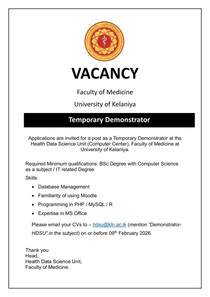 Please email your CVs to hdsu@kln.ac.lk on or before 09th February 2026