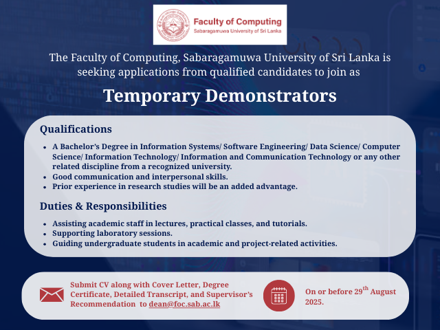 The Faculty of Computing, Sabaragamuwa University of Sri Lanka invites applications for the post of Temporary Demonstrators.