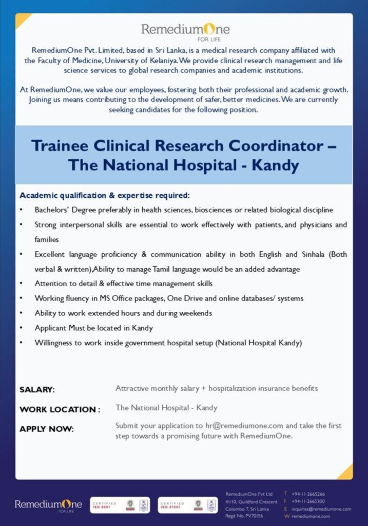 RemediumOne is looking for a dedicated professional to join our team at National Hospital Kandy. This is an exciting opportunity for candidates with a passion for healthcare and patient care.