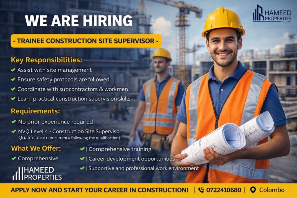 Engineering Internship Supervisor Trainee Construction Site Supervisor 4 minutes ago Deadline:- 2nd February 2026 Company:- Hameed Properties Whatsapp your CV:- 0722410680 Location:- Colombo Post navigation Previous: Quantity SurveyorNext: English Teacher Related Vacancies Draughtsman Engineering Trainee Draughtsman 2 hours ago Engineering Trainee Technical Officer 2 hours ago Aviation Engineering Aircraft Technician 4 hours ago