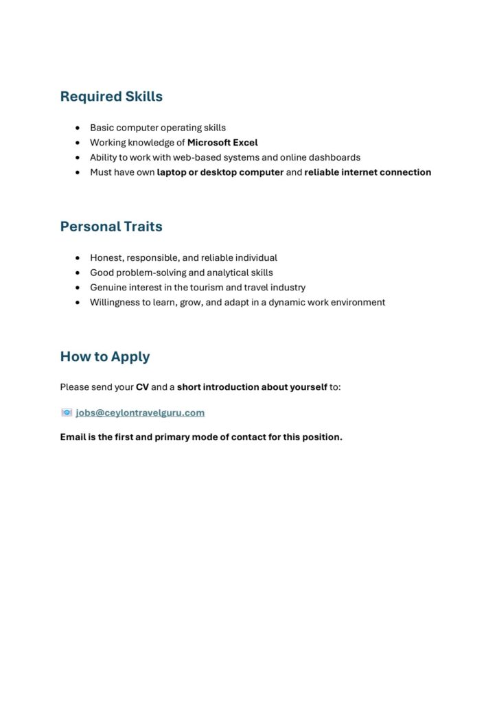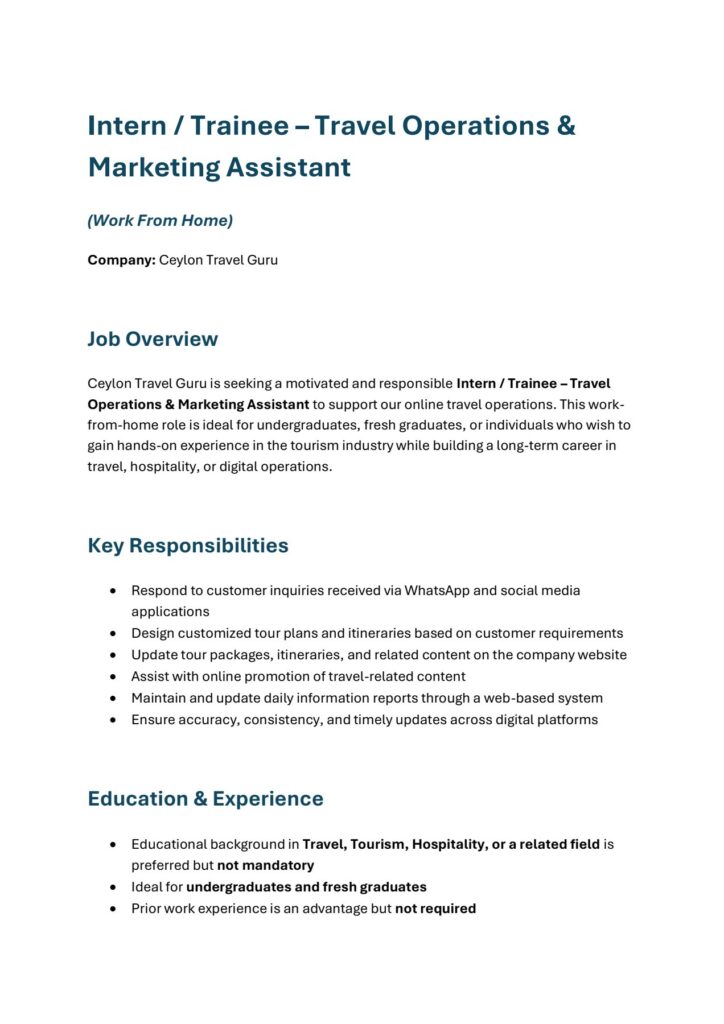 Trainee/ Internship – Travel Operations & Marketing Assistant