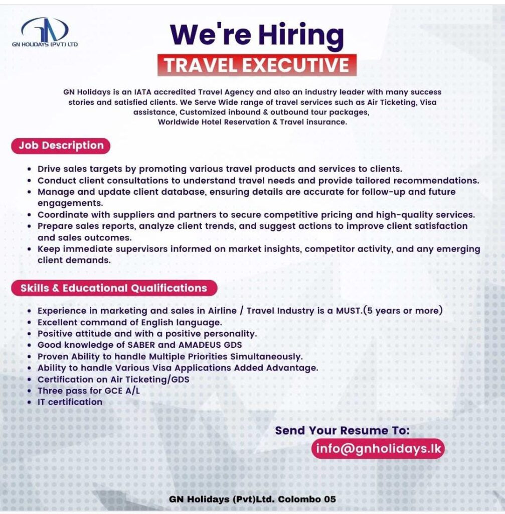 Join Our Team as a Travel Executive at GN HOLIDAYS (PVT) LTD